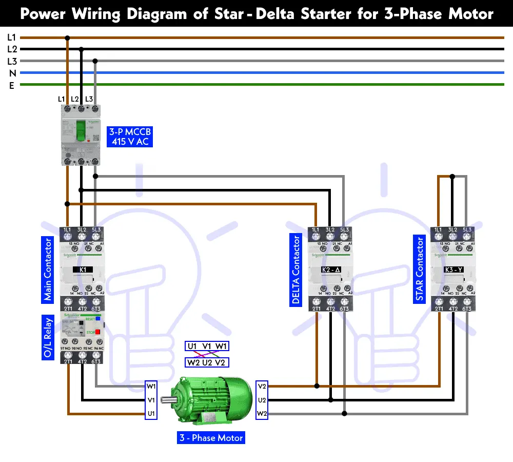 3. K2 and K3 have auxiliary contacts that prevent both contactors from engaging at the same time, ensuring the transition from star to delta is smooth and without short circuits.